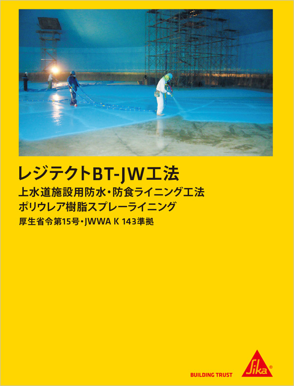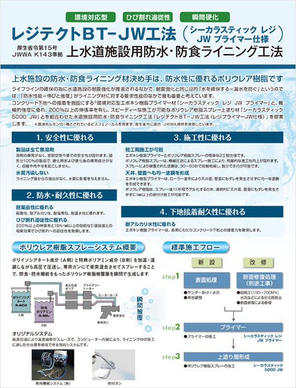 BT工法とは、イソシアネートと特殊アミンの2成分を、自動定量混合スプレー装置を使用して圧送・混合・吐出させ、施工面にスプレーし、瞬時にポリウレア樹脂塗膜を形成する被覆防食ライニング工法です。十数秒で硬化するため、壁面はもちろんのこと天井面でもダレることなく均一な防食ライニング層が形成されます。 そのため大幅な工期短縮が図れ、水道施設のコンクリート構造物や鋼構造物などの防食・防水・保護を目的とする改修工事に、画期的な超速硬化ポリウレア樹脂スプレーライニング工法です。